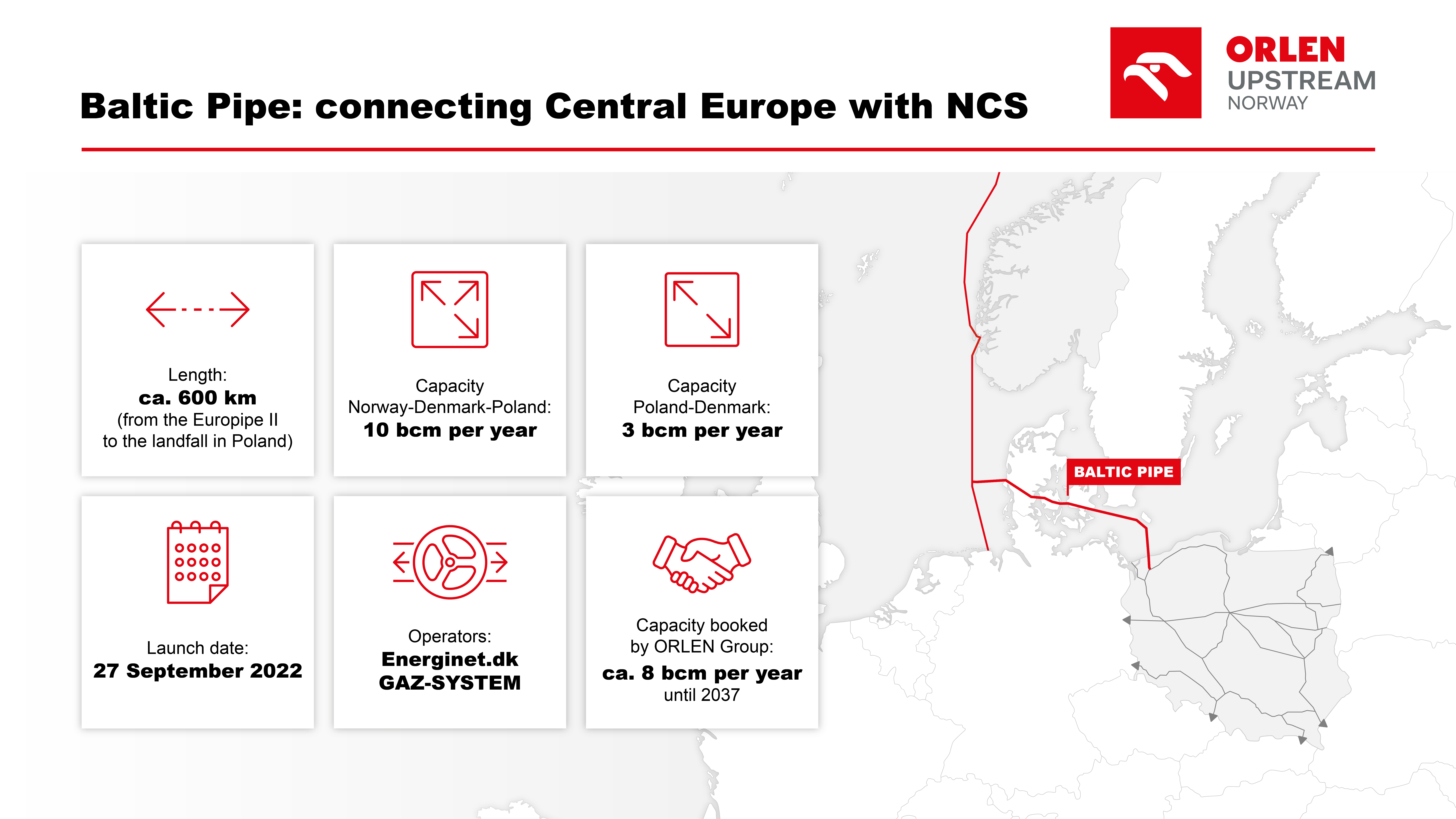 Baltic Pipe enables the transportation of 10 bcm/year natural gas from Norway to Denmark and Poland and 3 bcm/year gas from Poland to Denmark. The pipeline became operational in October 2022 strengthening Central and Eastern Europe energy security by providing a direct access to natural gas produced on the Norwegian Continental Shelf. ORLEN Group booked most of the pipeline capacity.