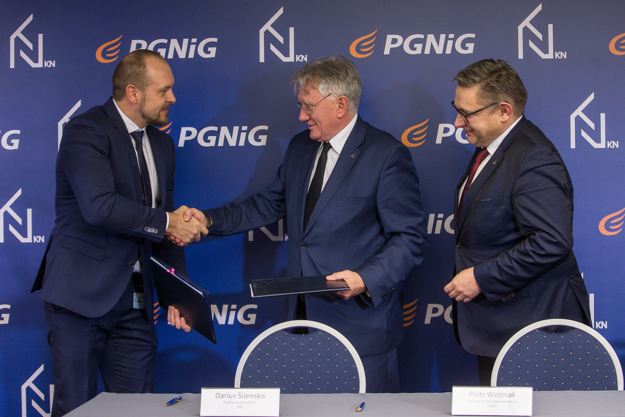 Photo: Mr. Darius Šilenskis, CEO of KN (left); Mr. Piotr Woźniak, President of the PGNiG Management Board (centre); Mr. Maciej Woźniak, Vice-President of the PGNiG Management Board for Trade.